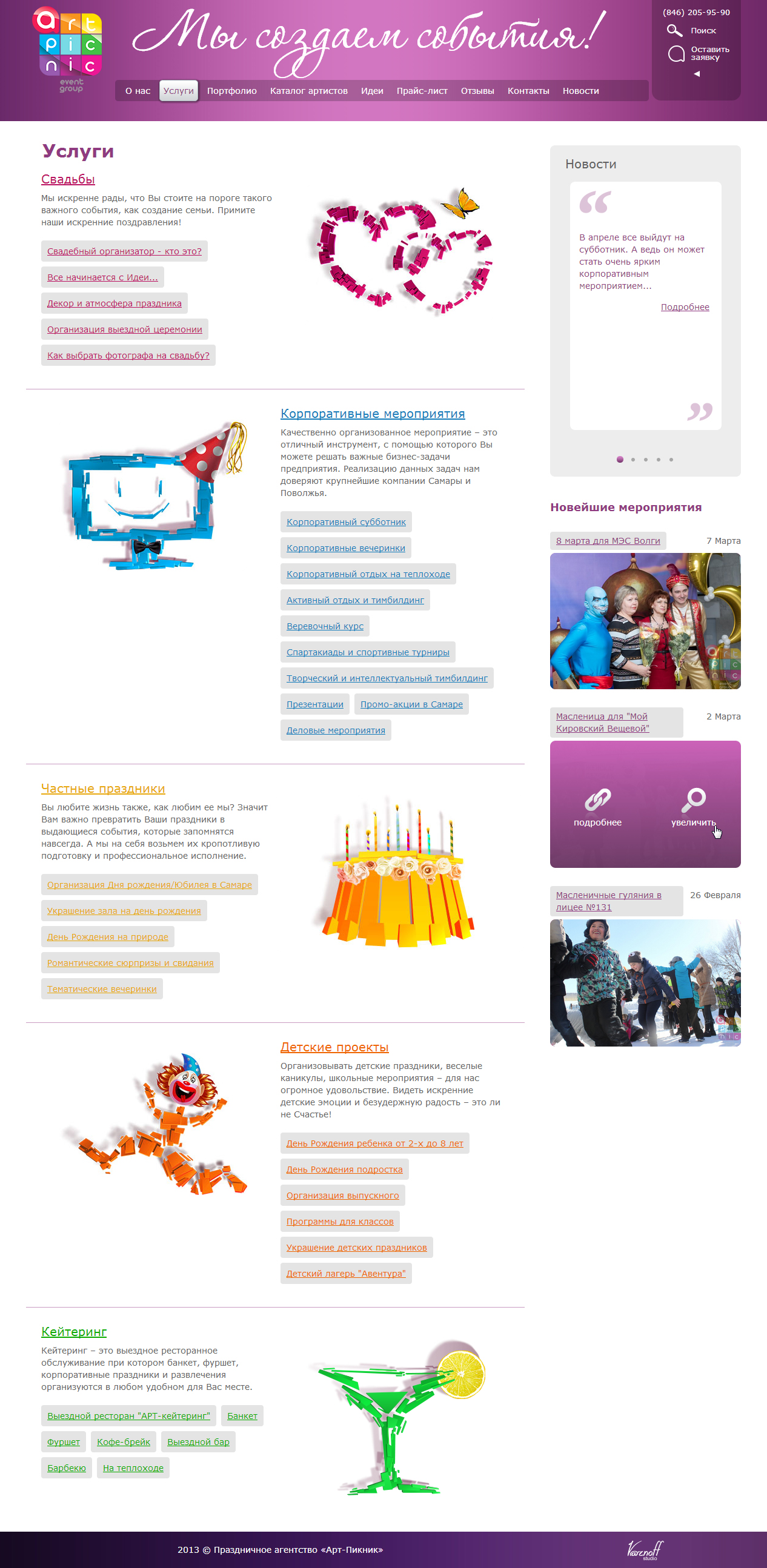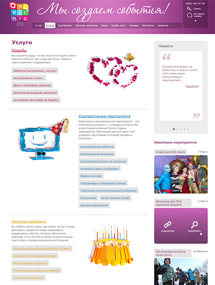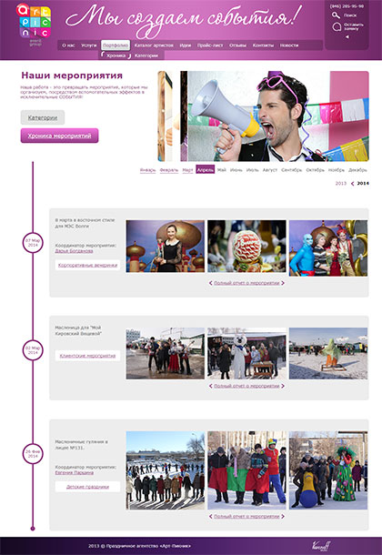 Портфолио ивент-агентства «Артпикник» — это большой перечень проведенных праздников и мероприятий. Чтобы добиться ясного и привлекательного представления информации, мы использовали хронологический подход, расположив все события на наглядной временной шкале. Каждое событие представлено заголовком, краткой информацией и набором иллюстраций. У пользователя есть возможность просмотреть на одной странице всю «историю компании», а также легко перейти к внутренней странице каждого события, содержащей подробный отчет и большое количество фотографий.