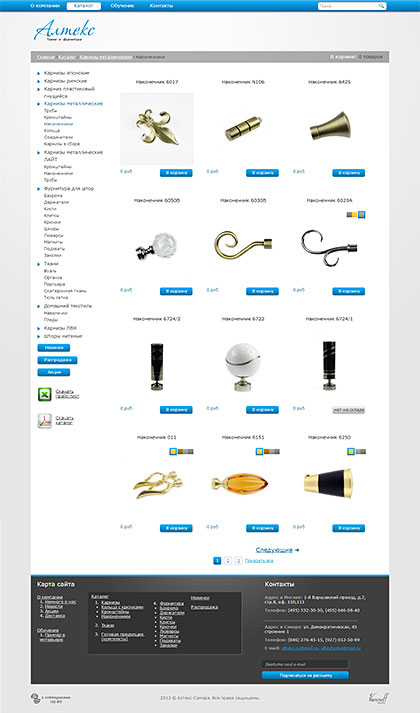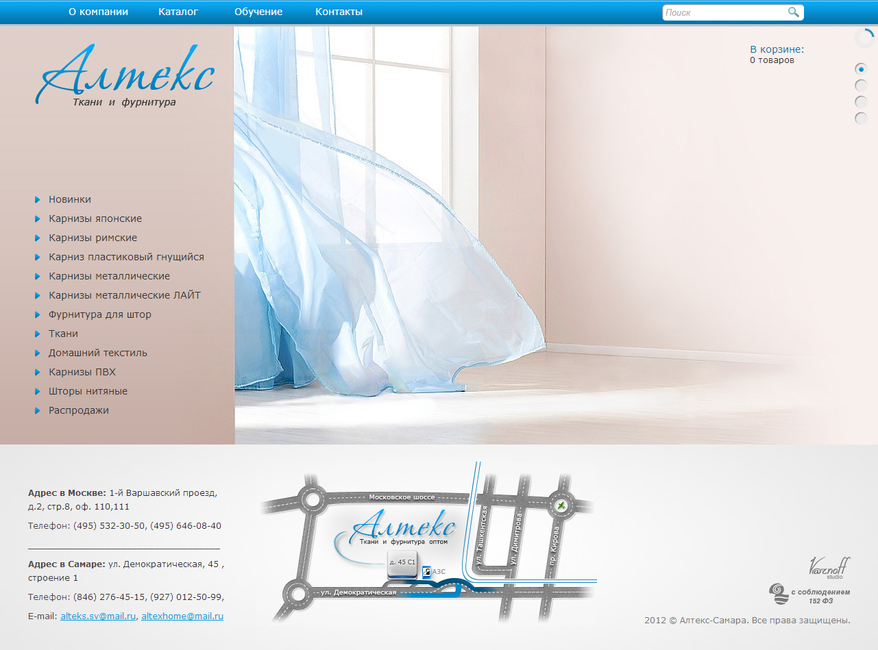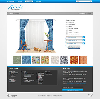 При разработке оформления сайта компании «Алтекс», специализирующейся на продаже тканей для штор, фурнитуры, карнизов и разнообразного текстиля, мы решили опереться в первую очередь на саму специфику продукции компании. Фактура ткани, ее сборки и переливы диктуют спокойное, мягкое оформление, исполненное в светлых пастельных тонах с голубым в роли цветовой доминанты.
