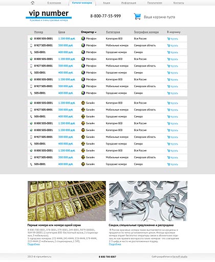 Как и в любом другом интернет-магазине, главный элемент сайта VipNumber — каталог товаров, в данном случае — красивых телефонных номеров. Каталог разбит на несколько категорий по типам номеров и операторам связи, что значительно облегчает поиск. На момент запуска сайта каталог содержит около восьми тысяч лотов и в будущем он будет только пополняться. Поскольку информации о каждом конкретном номере немного, лоты не имеют своих собственных внутренних страниц, оставаясь только строчкой в общем каталоге. Каждая строчка содержит кнопку «Купить», отправляющую выбранный красивый номер в корзину. После того, как пользователь выберет все нужные ему номера, он сможет перейти в корзину и пройти несложную процедуру оформления заказа.