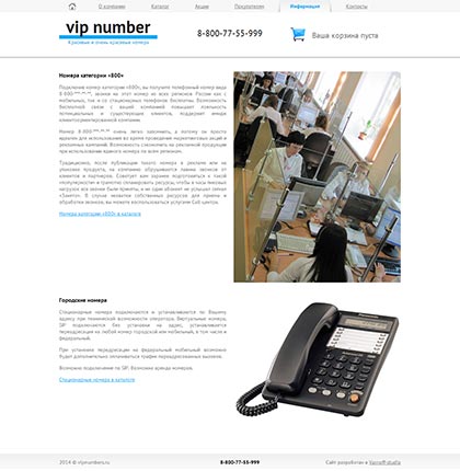 Интернет-магазин красивых номеров VipNumber отличается минималистичным дизайном и сжатым, концентрированным представлением информации. Главная страница сайта кратко знакомит посетителя с содержанием всех основных разделов: она содержит мини-каталог с «избранными» номерами и ссылками на полную версию, информацию о двух самых интересных акциях из соответствующего раздела, справочную информацию в виде блока с вкладками.