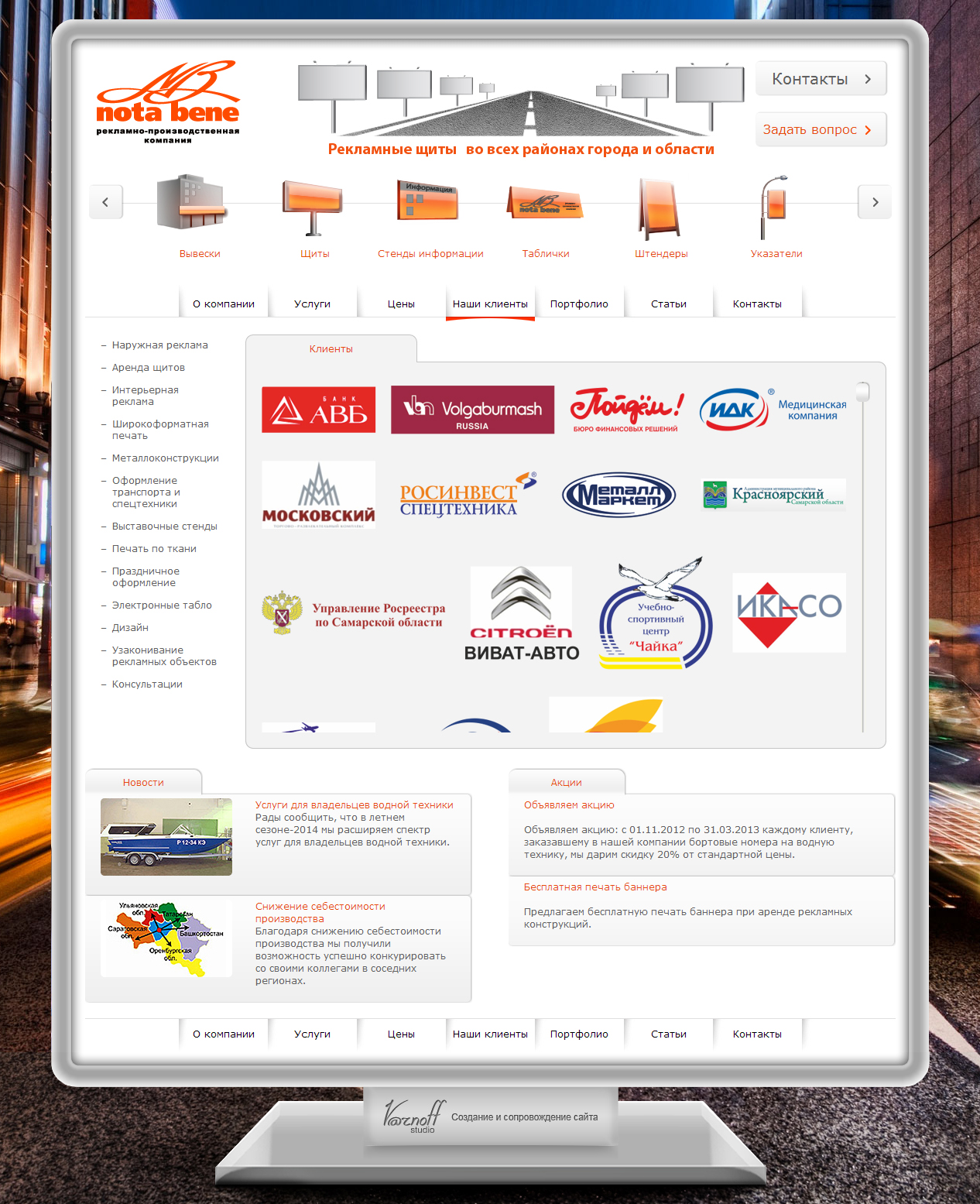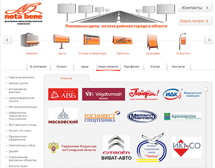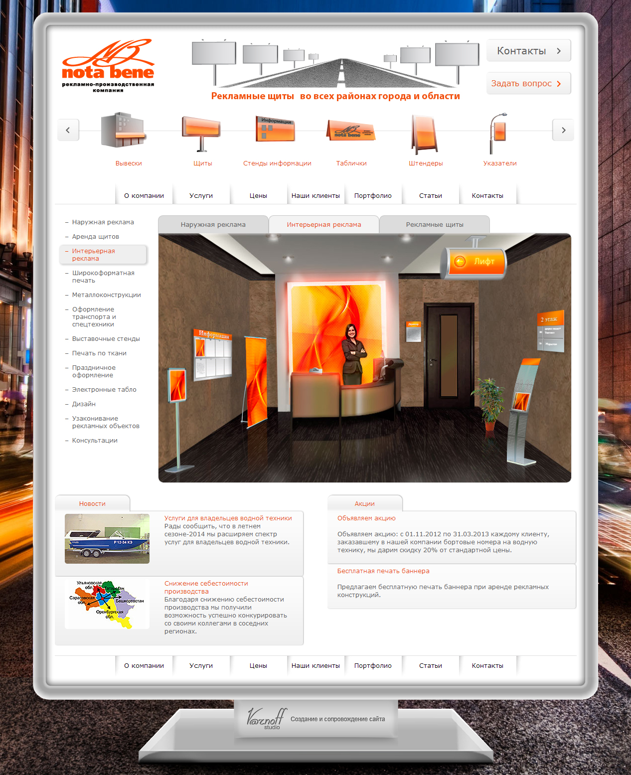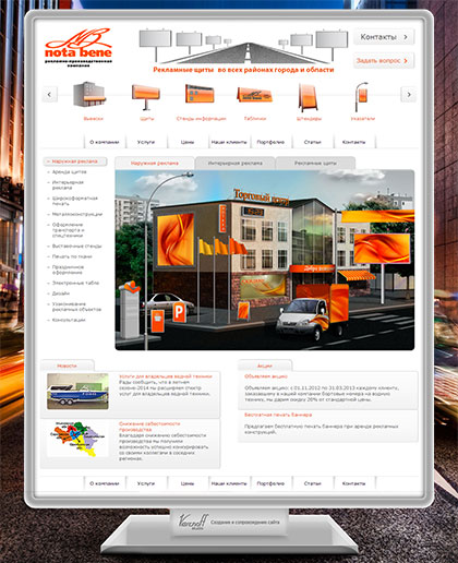 Для сайта компании «Nota Bene», занимающейся размещением наружной и интерьерной рекламы, нами был выбран яркий бело-оранжевый вариант оформления, призванный отражать, соответственно, яркость и заметность продукта компании. Страницы сайта представляют собой изображение рекламного биллборда на фоне вечернего города. Два основных текстовых меню расположены рядом и выполнены в виде закладок.