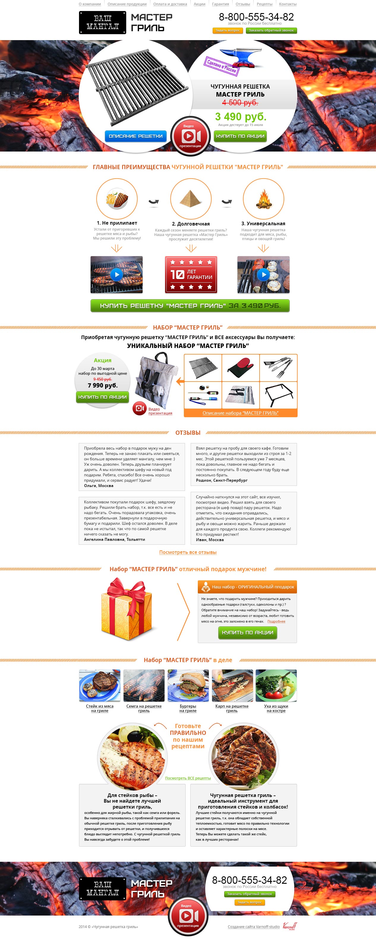 Особенность сайта «Мастер Гриль», разработанного для компании «Ваш Мангал», состоит в совмещении им функций и элементов классического сайта-каталога и промо-сайта. Главная страница сайта представляет собой эффективную «посадочную страницу», созданную с учетом соответствующих маркетинговых технологий. По сути, на странице предлагается всего один вид продукции, что характерно для промо-сайтов. Контент страницы носит рекламный характер, сразу же демонстрируя пользователю все достоинства продукции в яркой и убедительной подаче. Каждый блок страницы в той или иной форме призывает пользователя совершить покупку. Большое количество заметных и привлекающих внимание кнопок «Заказать» на странице — также типично для промо-сайта.