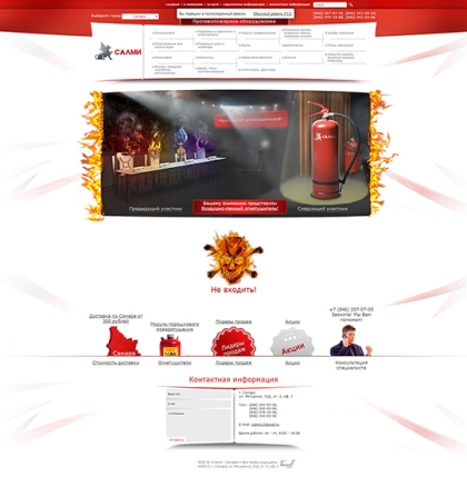 Сайт компании «Салми» выполнен в ярких цветах, использованы крупные шрифты и большие, заметные изображения и иконки. Доминирующие цвета (красный и белый), учитывая оформление некоторых элементов сайта языками пламени, твердо ассоциируются с противопожарной тематикой.