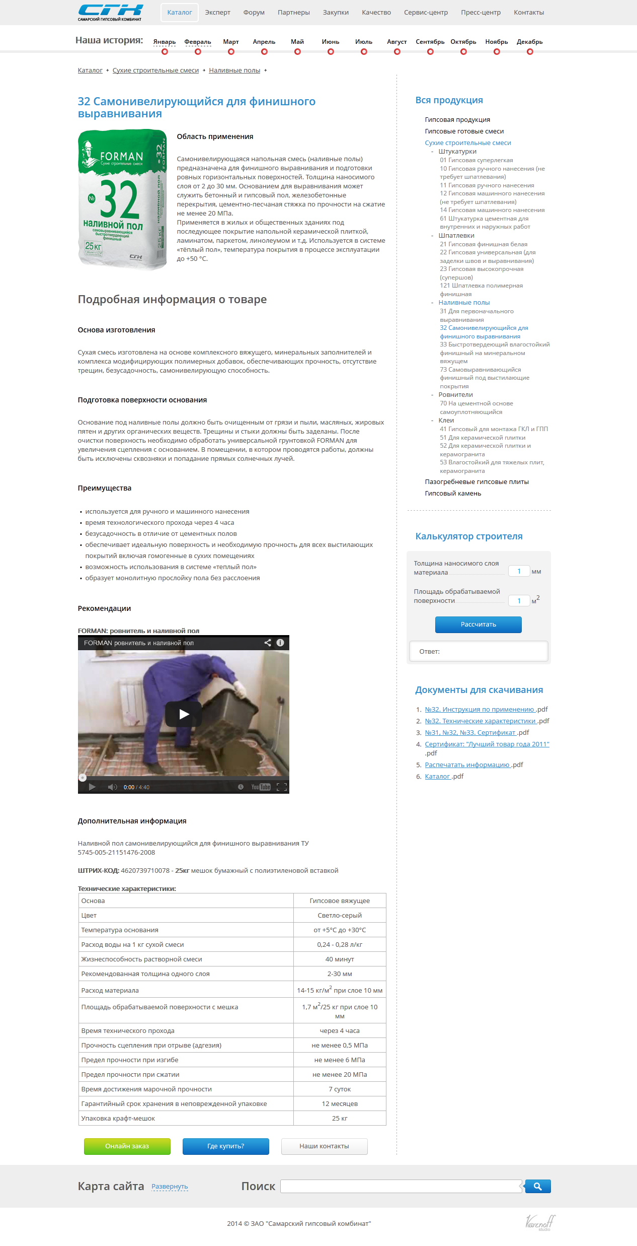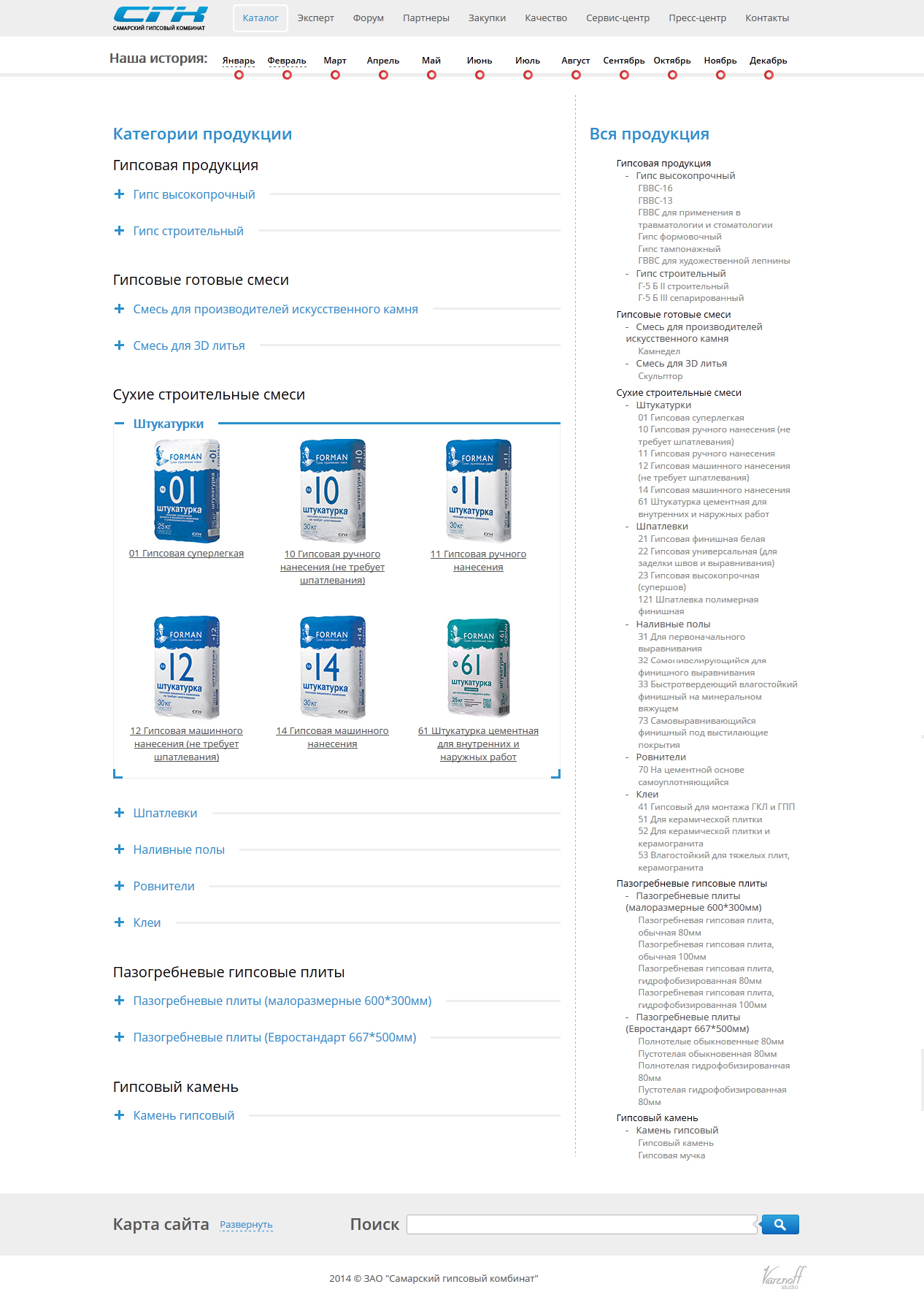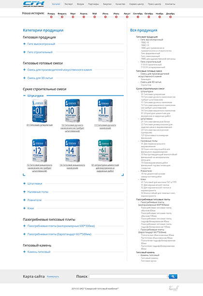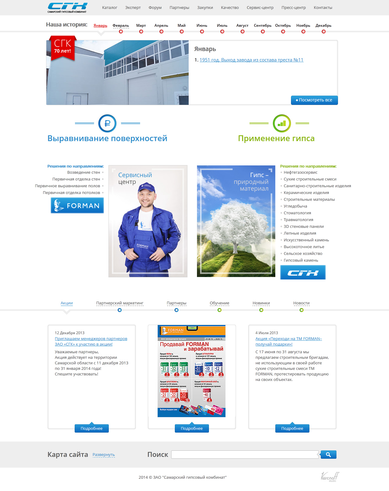 Главная страница сайта Самарского Гипсового Комбината выполнена с учетом фирменного стиля предприятия и призвана подчеркнуть важность продукции компании для многих областей строительства и производства. Страница разделена на две колонки, логически разделенные с помощью двух разных цветов. Меню каждой колонки иллюстрировано слайдером с яркими тематическими фотографиями. Также главная странциа содержит динамическую вставку с последними материалами разделов «Новости», «Акции», «Новинки», «Обучение» и др.