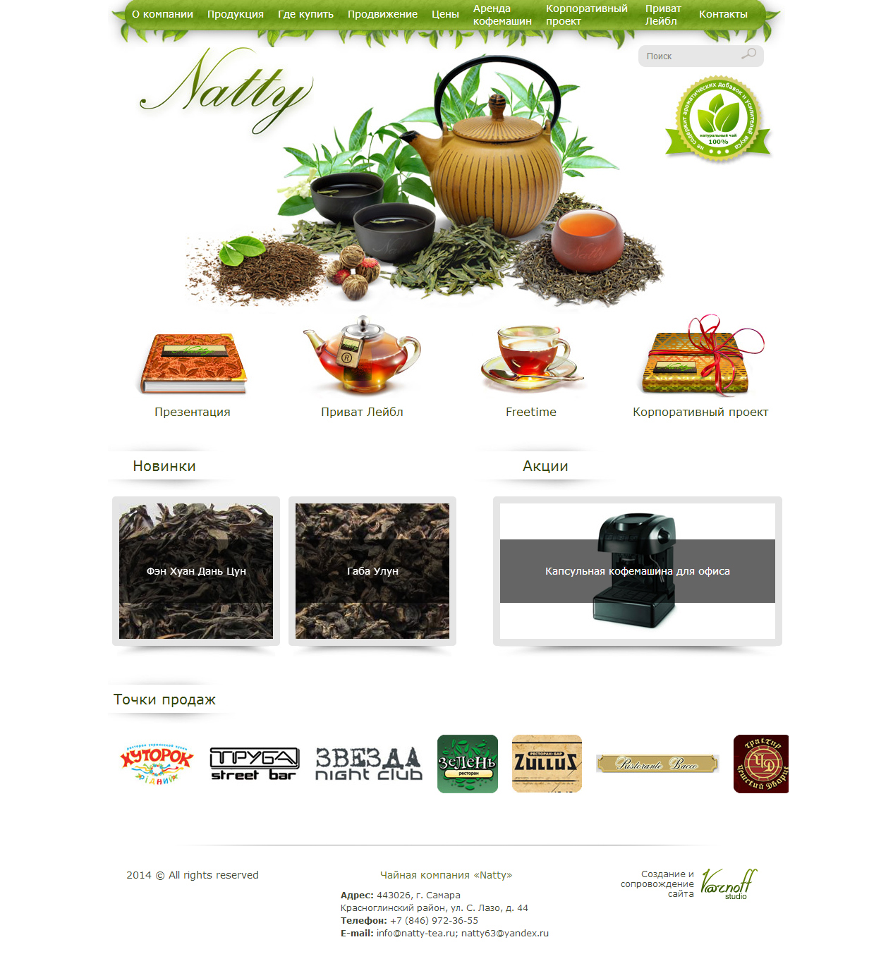 Помимо этого, главная страница предлагает посетителю два небольших слайдера, отображающих проходящие акции и новинки ассортимента. Ниже расположен графический перечень точек продаж продукции компании (логотипы ресторанов, кафе и клубов). Таким образом, нам удалось добиться сочетания легкости и незагруженности стартовой страницы с высоким уровнем ее информативности и большой свободой навигации.