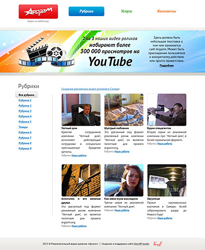 Видеопортал Argazm.org создан нами по заказу компании, занимающейся одним из самых современных видов рекламы — созданием и распространением вирусного видео. Сайт представляет собой видеодневник с возможностью просмотра каждого ролика, снятого в рамках проекта, прямо на сайте. Помимо самих видеороликов, на сайте присутствует несколько страниц с описанием услуг компании. Оформление сайта не отличается помпезностью — простота дизайна подчеркивает ценность предлагаемого ресурсом контента. Единственным декоративным элементом, помимо логотипа компании, является яркий горизонтальный блок с небольшим продающим текстом.