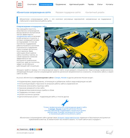 Мы готовы делиться полезными советами и новинками по продвижению и сопровождению сайтов, но всё это на корпоративном сайте никак не разместить. Потому мы и создали сайт, полностью отвечающий всем требованиям к продаваемому сайту. А именно, выбрали узнаваемый дизайн, он довольно прост, но в памяти обязательно отложится; создали простую структуру сайта для быстрой индексации поисковыми системами; и наполнили сайт текстами, написанными как можно понятнее для обычного, далекого от компьютеров, человека. На сайте есть раздел со статьями — теперь наша команда может делиться с людьми всей информацией, связанной с продвижением и сопровождением сайтов.