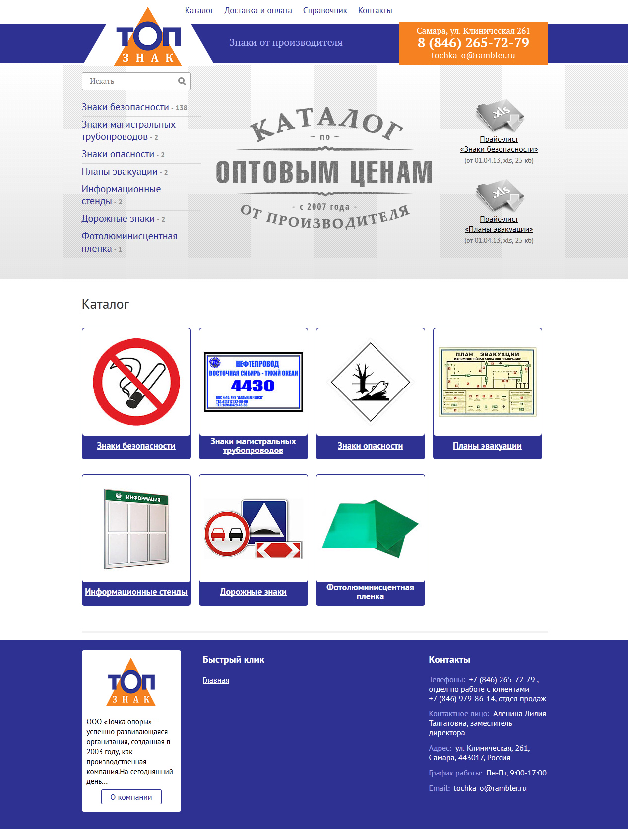 Для компании ООО «Точка опоры», занимающейся производством продажей предупреждающих и дорожных знаков, планов эвакуации, стендов и т.д., нами был разработан сайт-каталог, отражающий весь спектр их продукции в удобной и наглядной форме. Для сайта был разработан яркий дизайн с большими графическими элементами и шрифтами, что отражает специфику продукции компании.